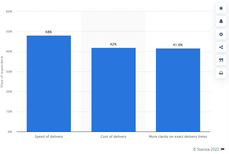 The further your merchandise must travel, the more expensive your shipping costs will be and the more time it takes to the hands of your shoppers. One of the most notable behaviors among online shoppers today is their claim for the fastest delivery, as shown in the graph below. To get the fastest turnaround times, it’s vital to have the inventory close to or within the borders of your target market.