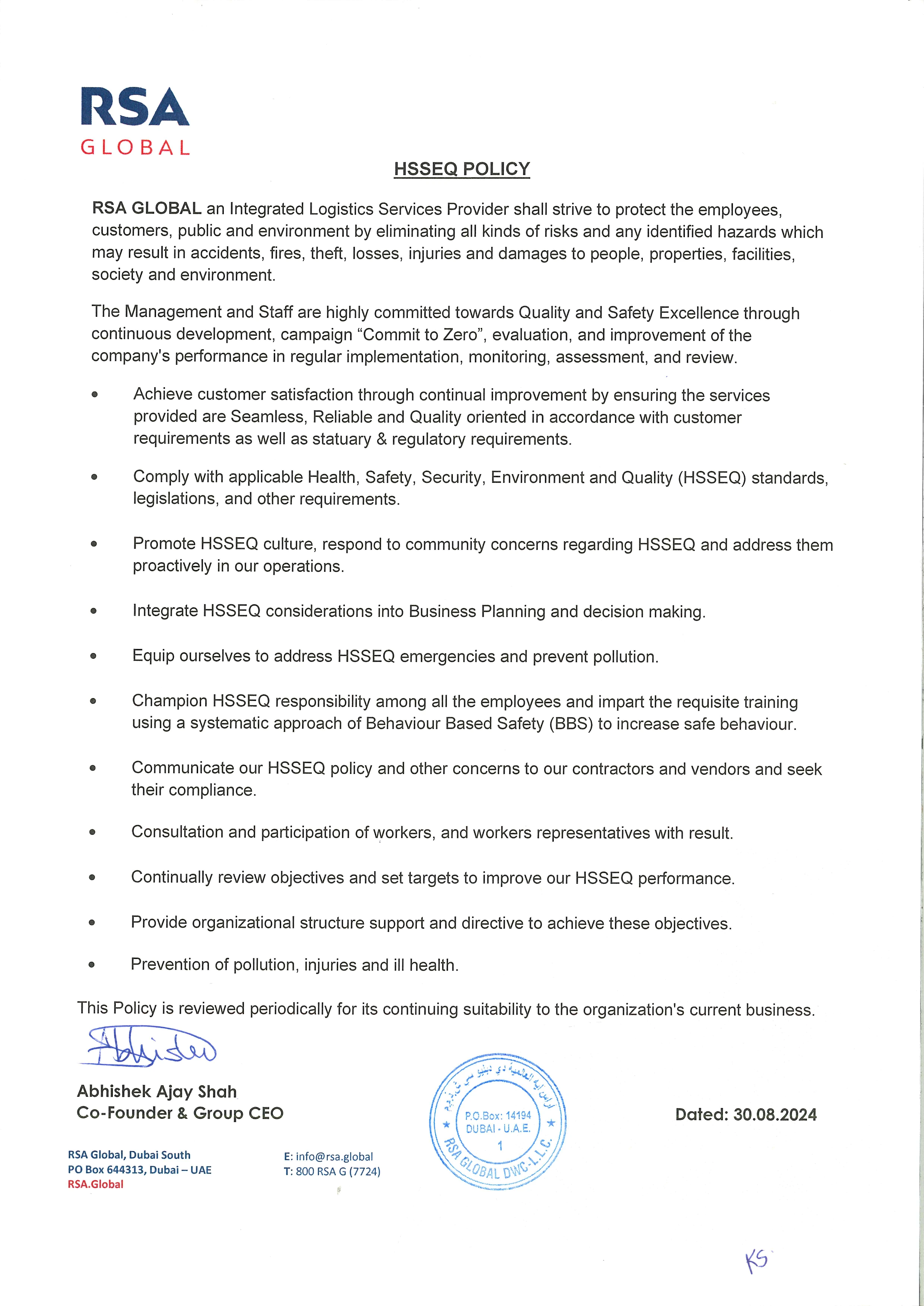 At RSA Global we are working together to achieve exemplary Health, Safety, Security, Environment and Quality performance in line with our core value being ‘WE ARE HSSEQ MASTERS’.