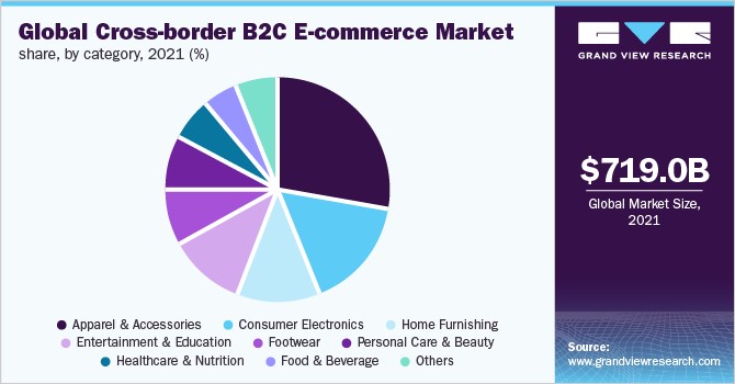 The B2C e-commerce market in the Middle East and Africa is anticipated to increase by 22.38% yearly to reach US$104.1 billion in 2022. While it is anticipated that the B2C e-commerce sector in India will grow to $98.4 billion by 2023. The main product categories in this industry that are booming are entertainment & education, consumer electronics, home furnishings, personal care & beauty, healthcare & nutrition, footwear, food & beverage, and others. Apparel and accessories now hold the biggest market share.