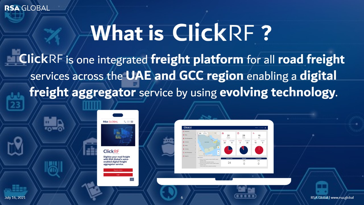 Through ClickRF shippers can inquire rates for any land lane within the UAE and GCC region, compare and negotiate offered rates, book shipments, instantly track and trace them, perform online payments, and receive e-invoices, amongst others. In turn, transport providers can bid and adjust rates for requested lanes, manage orders, manage their drivers & fleet, receive online payments, and continuously optimize their operational processes by utilizing the system’s smart data. All steps are facilitated via a transparent real time communication between the supply chain stakeholders through the single window interface WhatsApp.